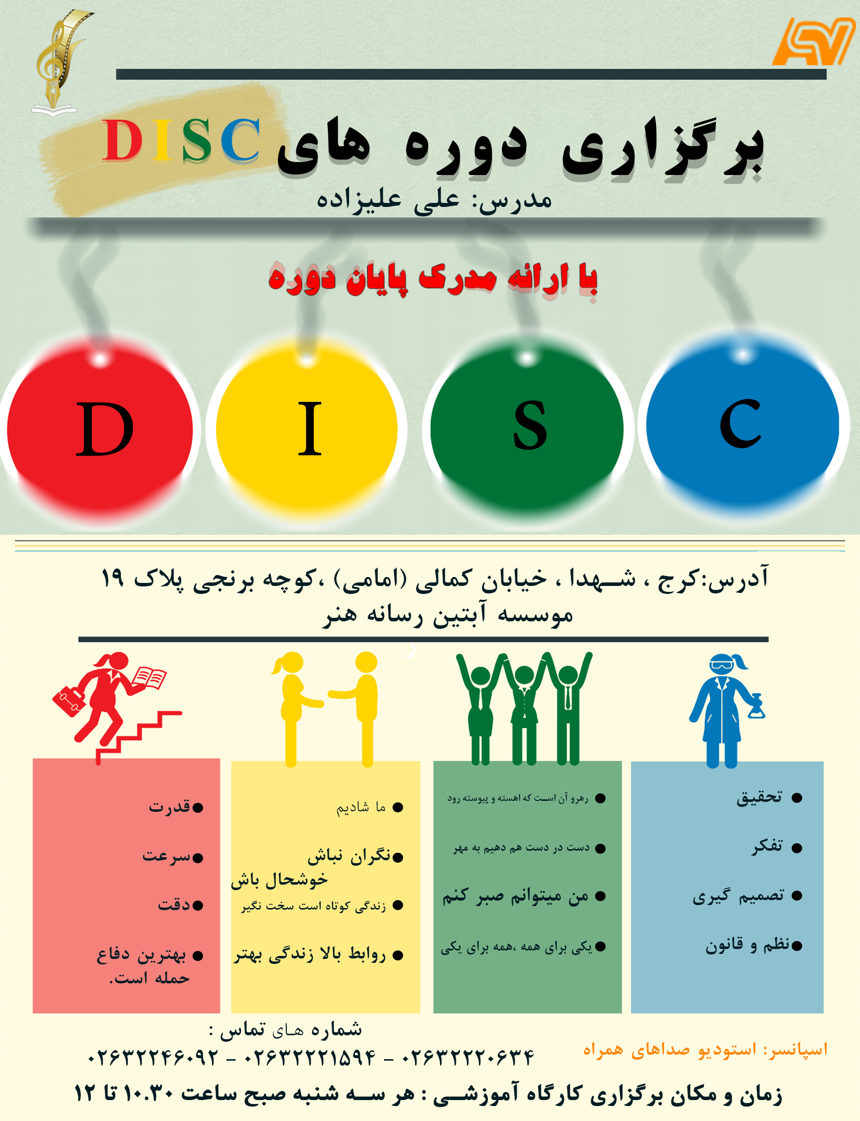 دوره آموزشی تیپ شناسی دیسک ، به همت مسئولین محترم موسسه آبتین رسانه هنر در کرج برگزار خواهد شد.